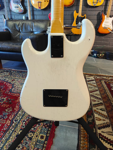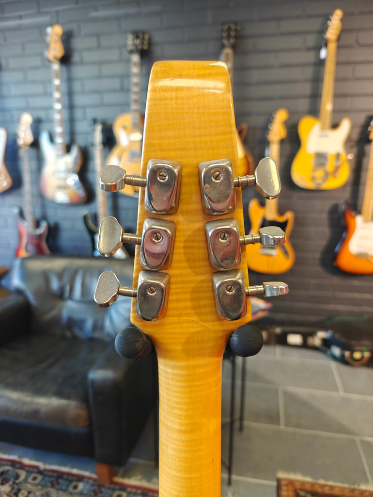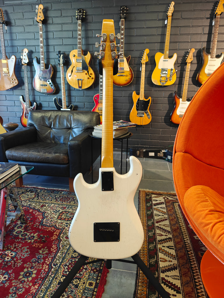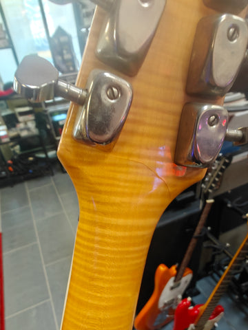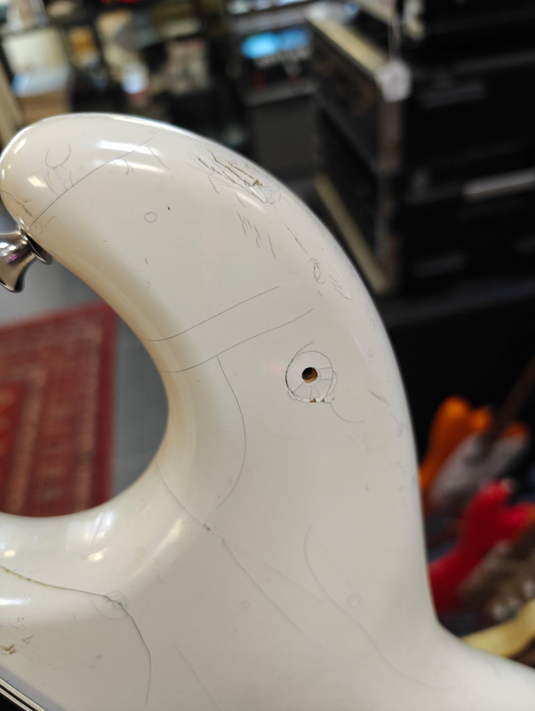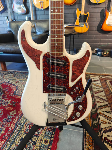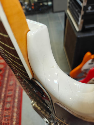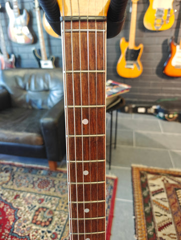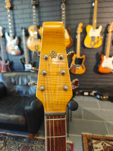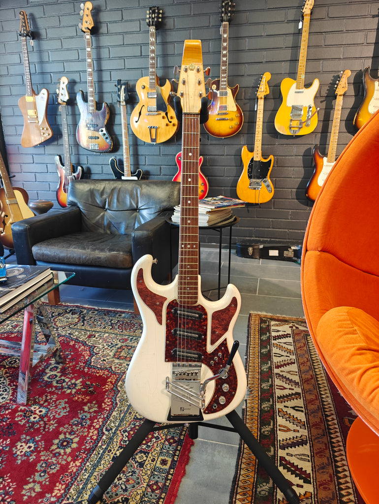 Original Burns signature model in a bit rough condition. There´s old fix on the body, that seems it has a crack. Original pickups, but three mini switches installed afterwards. The original pickup switcher taken away. Pickguards on horns are repro. Crack in the lacquer on the neck, but no physical fault.