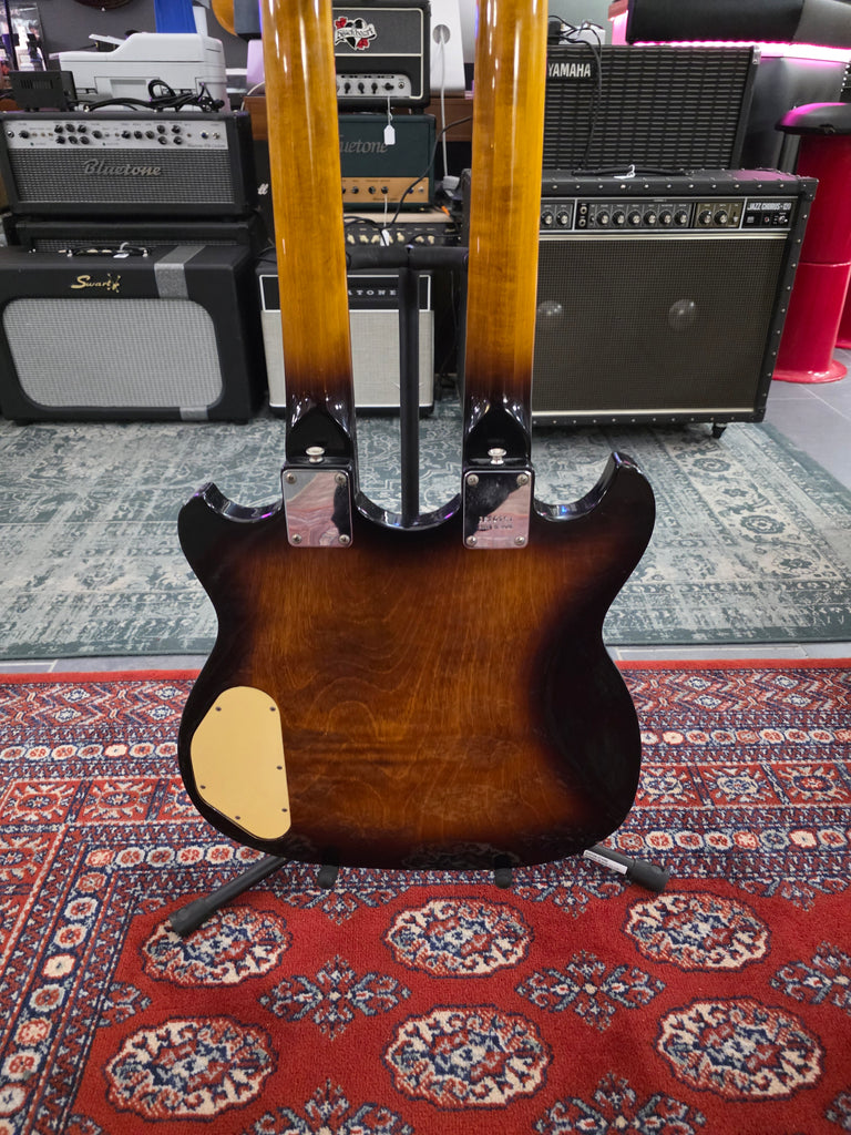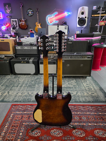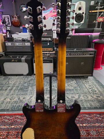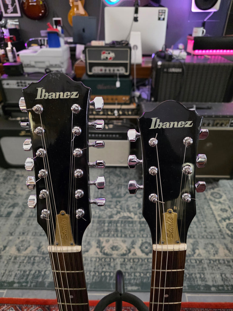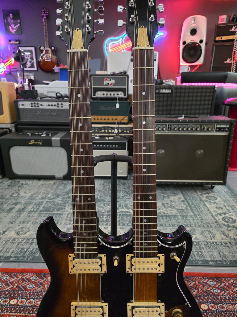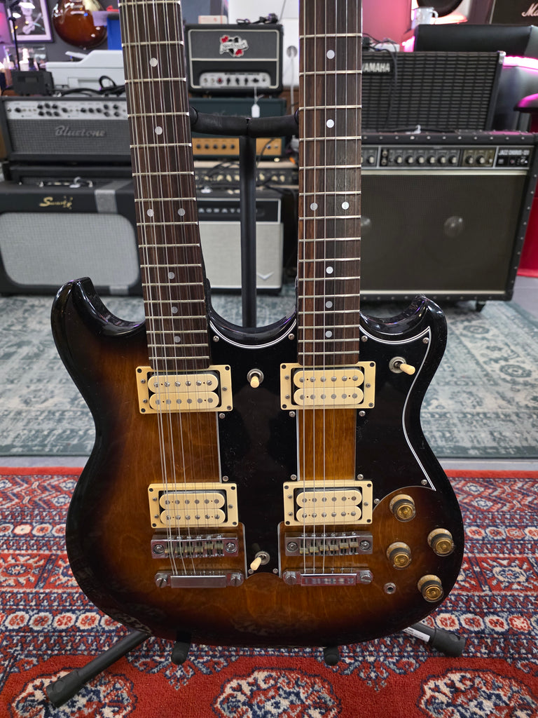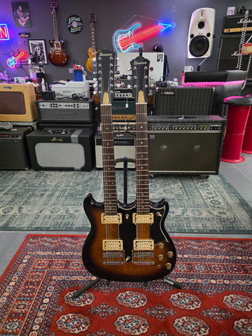We love double necks twice as much as we love single necks! This stunning Ibanez comes almost from its first owner. It has the original receipt in the case. Get your inner Jimmy Page Temu version out with this beast. Original hard shell case. Weight: yes, it has weight.