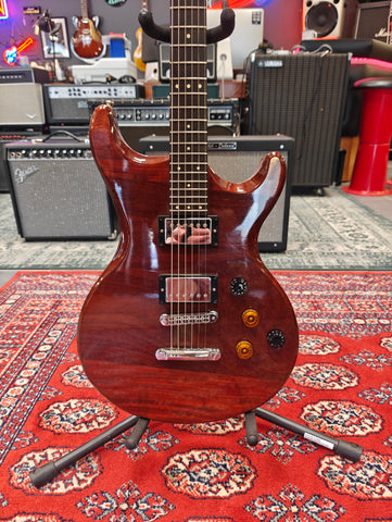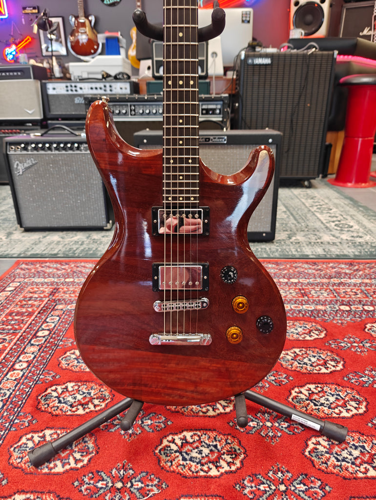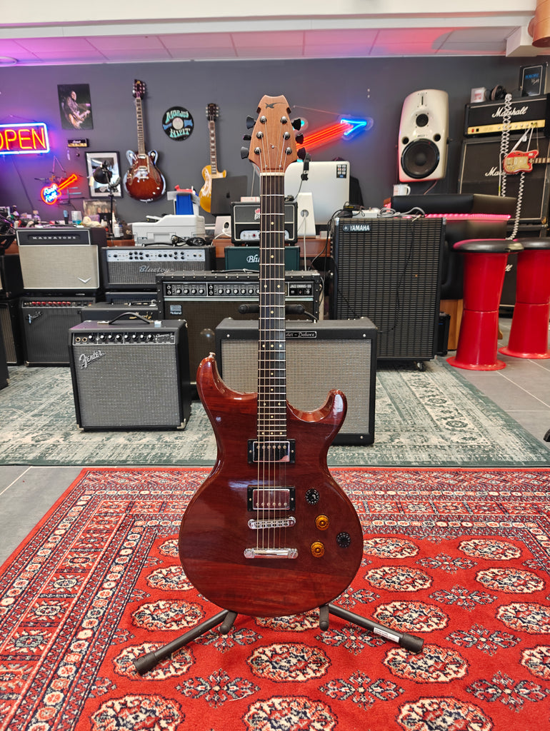 This guitar was made in circa 1996 by master luthier Lottonen, Helsinki. A robustly sounding solid body electric guitar with mahogany body, padouk top, Tru Oil finish + shellac lacquer in beautiful reddish brown.