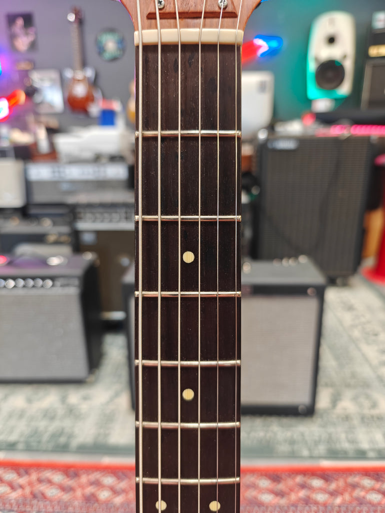 Previous owner had kept the guitar in C or D tuning, lower than normal with thicker strings. Works also as a baritone guitar.