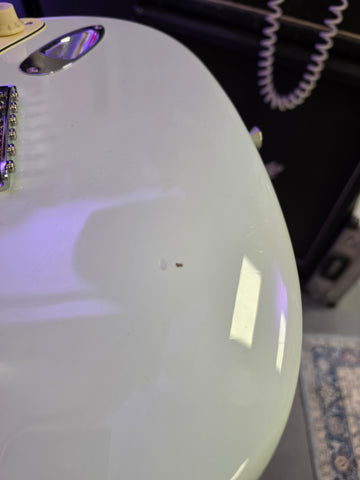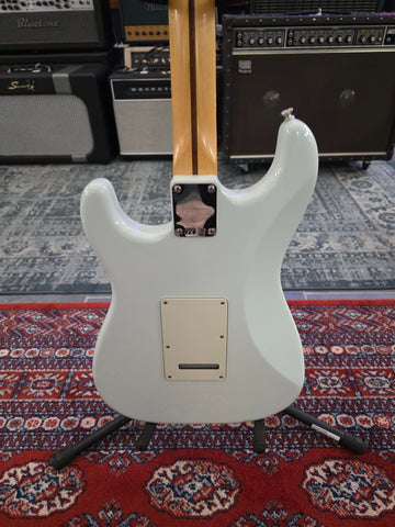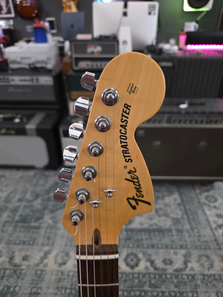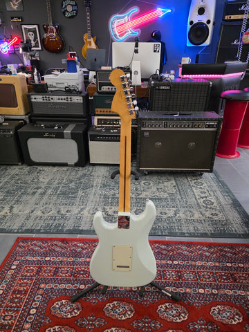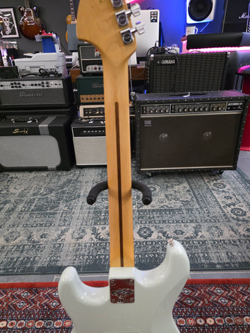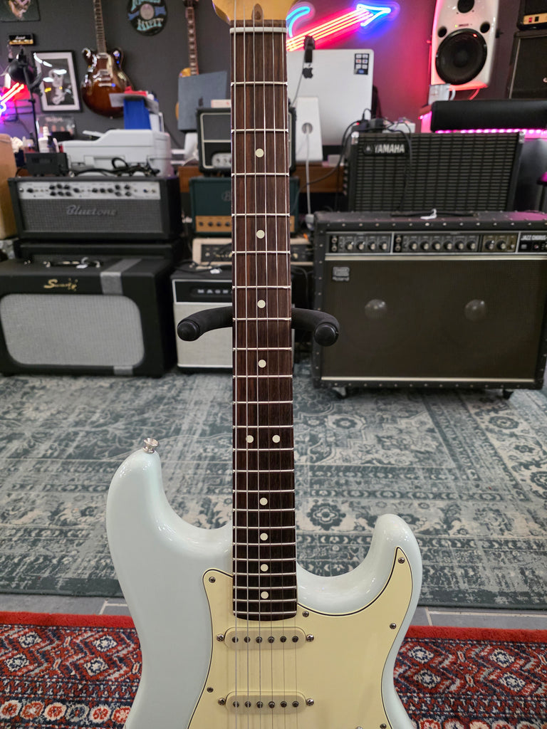 This strat has the classic looks. Sonic blue with yellowish parts are a combination hard to beat. Comes in Fender gig bag. Weight: 3.5 kg.