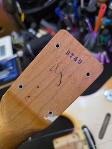 Guitar has rare stamp "66C" under the pick guard. This might indicate, that the body is made in 1966 and marked up to be Custom (C). The neck stamp dates to October 1967.