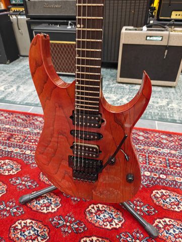 The RG1308 features a light ash body bolted to a maple neck with a 24-fret rosewood fingerboard with offset dot position markers. Components include DiMarzio pickups with two humbuckers flanking a single-coil, a Lo-Pro Edge double locking tremolo bridge, a locking nut and Gotoh tuning machines.