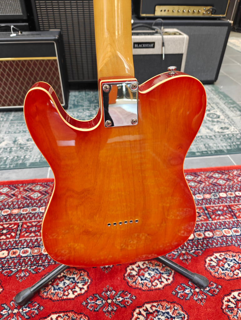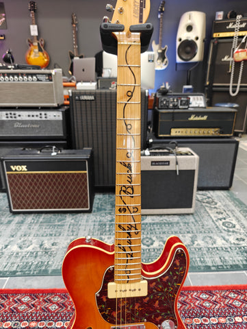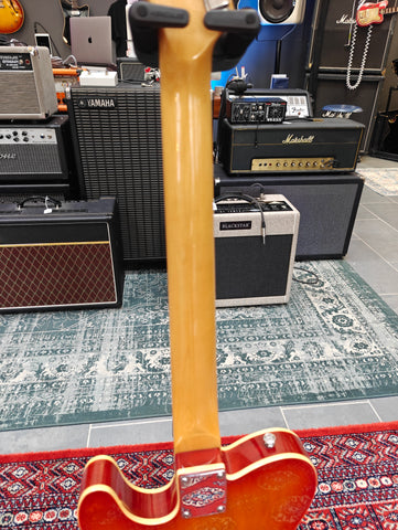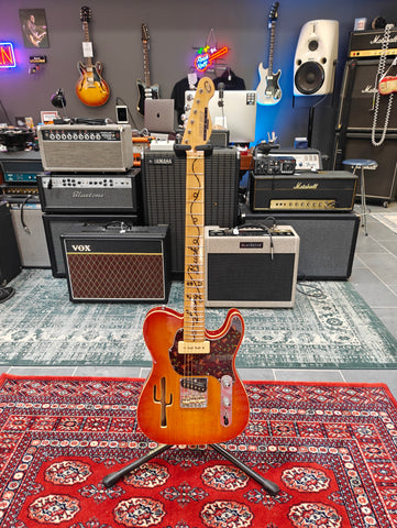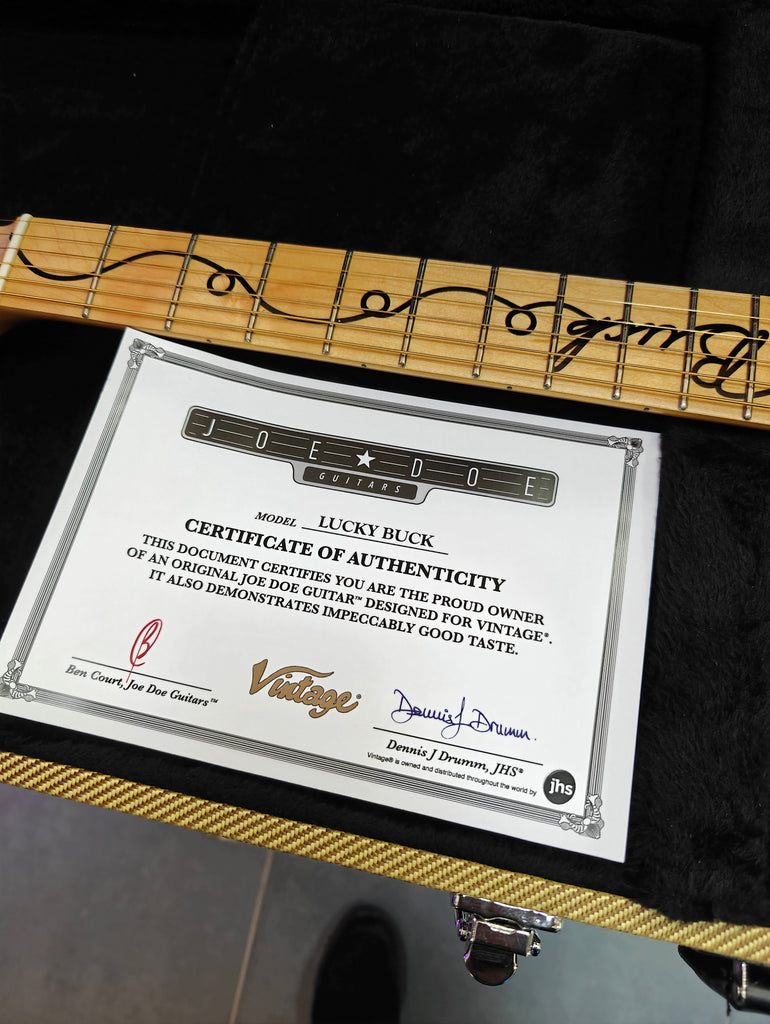Here for sale we have a Joe Doe by Vintage Lucky Buck in Honeyburst finish, featuring a double-bound semi-hollow Alder body, a Soft 'C' profile Maple neck, a 22 fret Maple fingerboard, along with a pair of custom designed Joe Doe single coil pickups, completed by a 'Saguaro' cactus shaped F-hole. This maverick of a guitar is based on the same instrument used by Leslie 'Lucky Buck' Coal on his first heartbreaker of a hit, 'Whiskey for Breakfast', all the way back in 1952. Later forced to write jingles for the hungry advertising industry of the time, Coal's sad tale is retold in this guitar.
