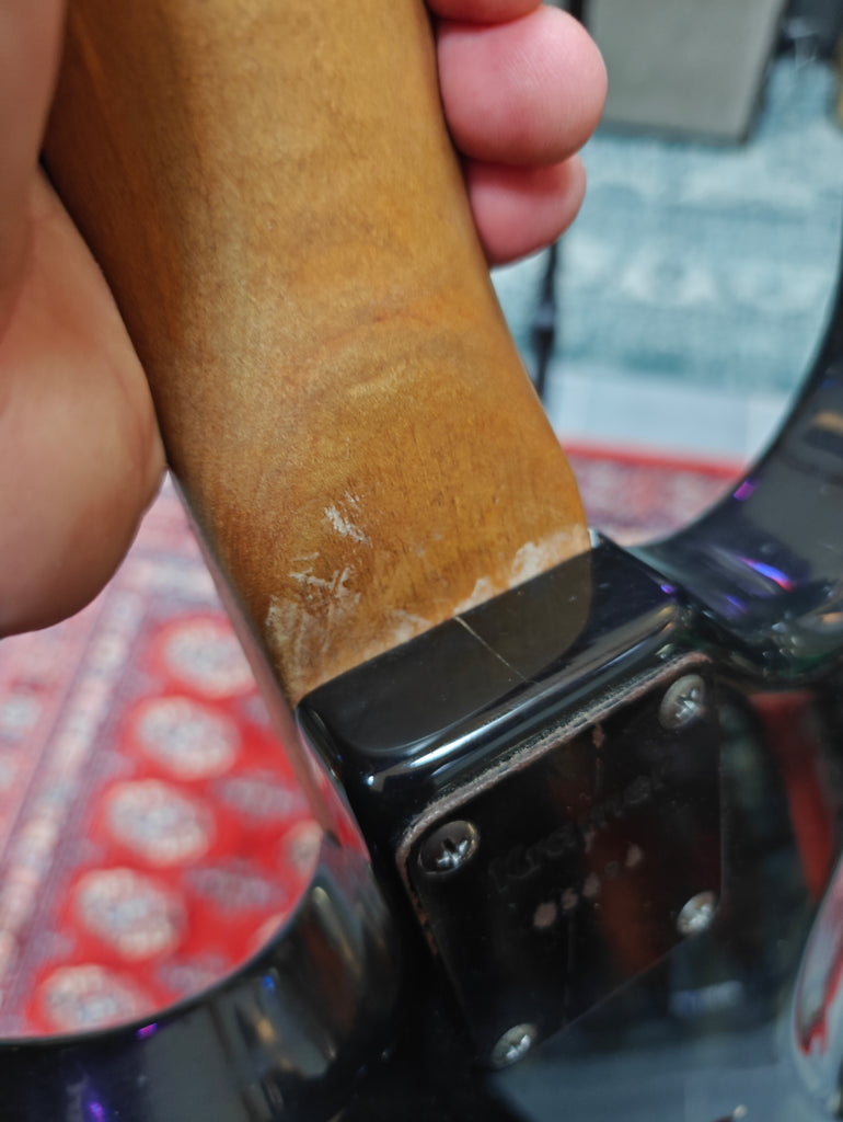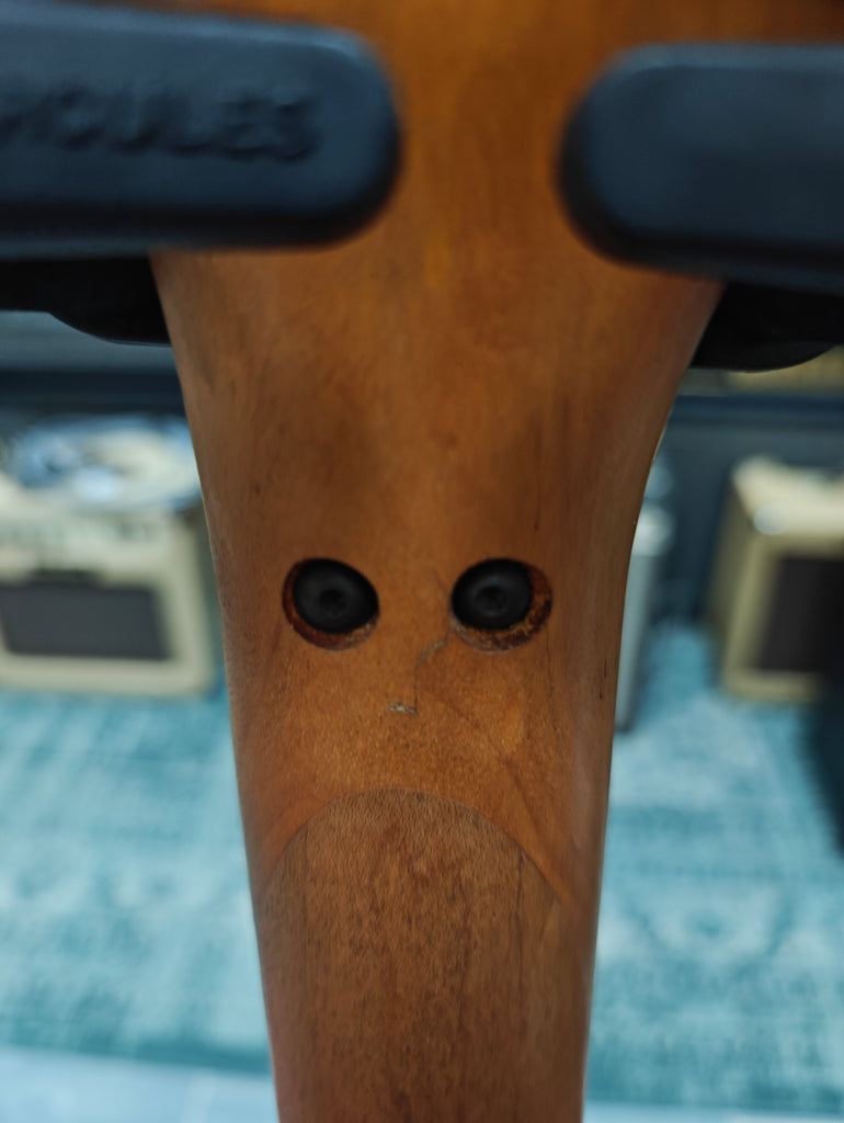 Cool example of the early run Baretta´s. This one surely has been tried and tested. The two piece body has been lived a bit, but it is stable. See the pictures. Seems that the seam has been stabilized at some time. Tweed hard shell case.