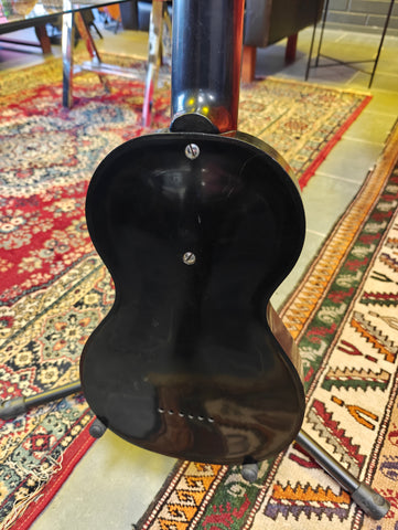 This guitar remains all original with no damage or repair, with the only alteration being the cord attachment. It shows signs of use in the Hawaiian guitar style, notably marks from the nut raiser and some scuffing to the metal parts, but no major wear. The plates have some scratches.