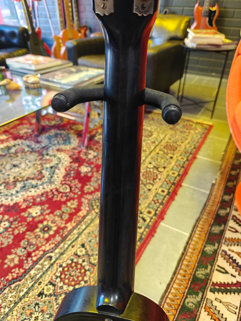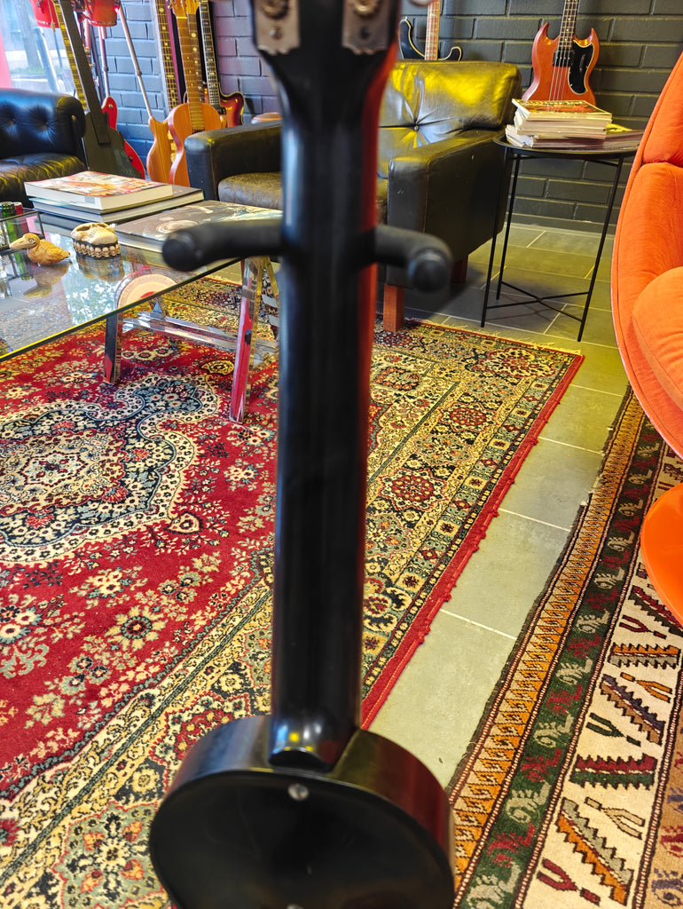 The pickup is made from Rickenbacker factory components, but the coil was wound in England to different specs. This example is laid out like the second generation American-made Model B with a volume control on the upper bout and tone control on the lower. It originally had a hardwired cord and is currently set up with two (smaller and bigger) female enclosed jacks.