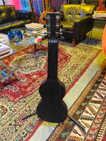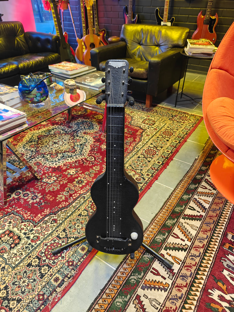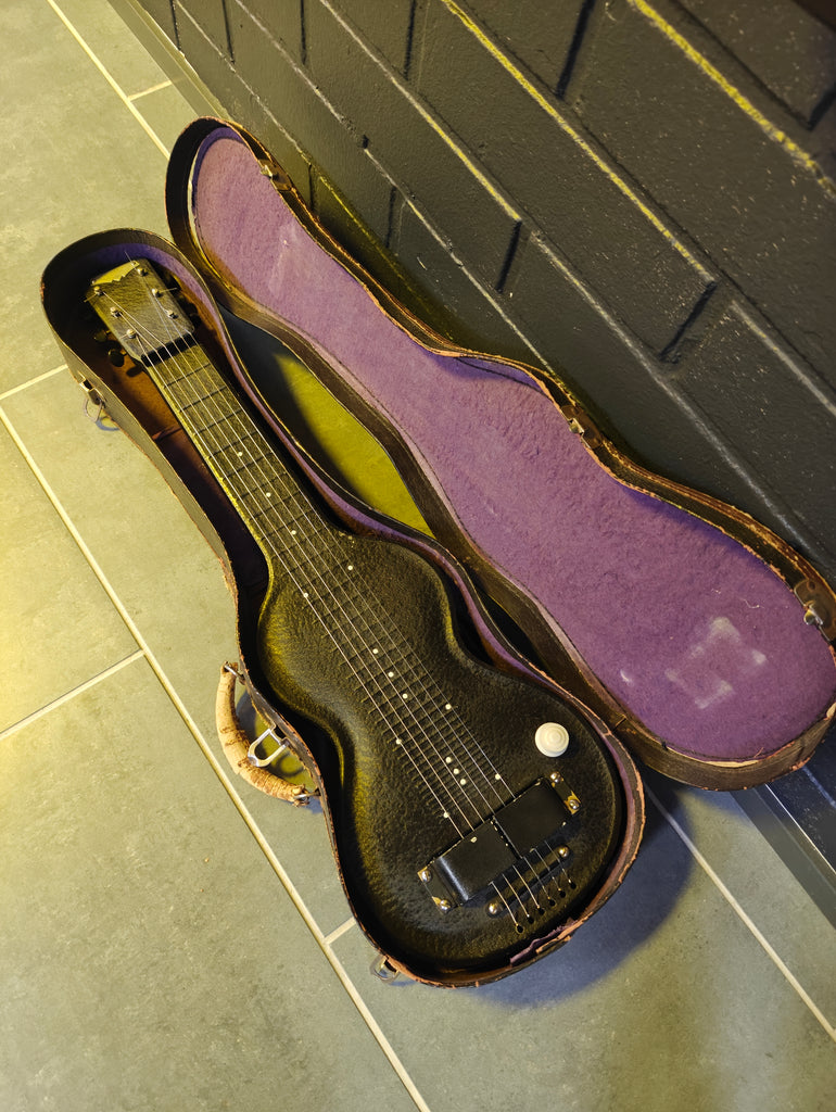 Frying pan! This classic lap steel comes in its roughly worn case.