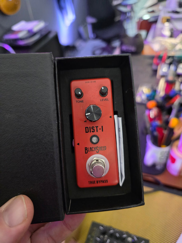 The Black Sheep Distortion-1 is a compact and sturdy distortion pedal with true bypass and a wide range of sounds that covers most needs, from bluesy leads to intense metal. It is easy to use, featuring controls for Volume, Tone, and Gain, allowing you to fine-tune your sound. The pedal operates on a standard Boss-style power supply, 9V DC (not included). With its durable aluminum chassis and chassis-mounted DC input, it's perfect for taking on the road without any hassle.